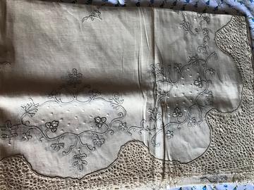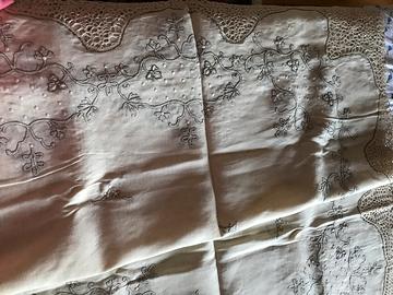 Anni ‘60. Tovaglia in pizzo pregiata ricamo a mano . Per 12 persone con tovaglioli. Lunghezza 2,76 m larghezza 1,76 m. Nuova mai usata.