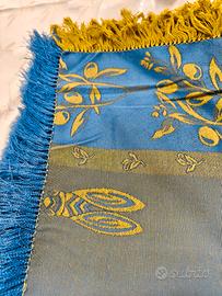 Bellissima tovaglia quadrata in stile provenzale autentico, caratterizzata da una raffinata lavorazione Jacquard che dona spessore e riflessi cangianti al tessuto. Un pezzo d'arredo solare ed elegante, ideale per una cucina rustica, una sala da pranzo Shabby Chic o per pranzi estivi in veranda. Dettagli e Stile Design: Motivo tradizionale con rami di ulivo carichi di frutti e l'iconica cicala, simbolo portafortuna della Provenza. Colori: Un accostamento classico e raffinato tra il blu aviazione e il verde oliva dorato. I colori vibrano a seconda della luce grazie alla tessitura dei fili. Finiture: Bordata su tutti i lati con una ricca frangia bicolore (blu e ocra) che aggiunge un tocco artigianale e di pregio. Specifiche Tecniche Dimensioni: 126 x 130 cm (escluse le frange). Una misura versatile per tavoli quadrati o tondi. Tessuto: Misto cotone/poliestere di medio peso, molto resistente e facile da stirare. La trama Jacquard garantisce che il disegno non sbiadisca con i lavaggi. Stato: Ottime condizioni. Senza macchie né fili tirati.