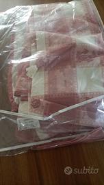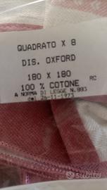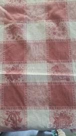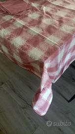 Tovaglia quadrata 180x180 cm, in 100% cotone con trama a scacchi piccoli, colore bianco e rosa carico, motivo a quadri con disegni tono su tono, bordata nello stesso colore dei tovaglioli. Nuova nella sua confezione originale