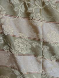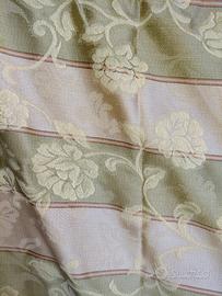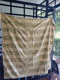 Bellissima tovaglia quadrata in tessuto jacquard, colore oro/verde salvia con motivo floreale damascato e righe orizzontali. Bordo rifinito con pizzo bianco su tutti i lati. Dimensioni: 152 x 152 cm Perfetta per tavolo da 8-10 coperti. Condizioni: buone, lavata e pulita cucita a mano