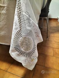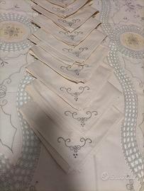 tovaglia rettangolare vintage in lino e cotone dimensioni 275 x 170 con 12 tovaglioli dimensioni 40 x 40 ricamati al uncinetto in ottimo stato