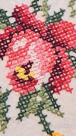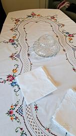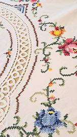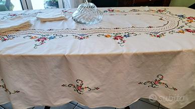 Bellissima tovaglia in cotone ricamata a punto croce e con inserti all'uncinetto. Misura cm 165 x 250 ed è in ottime condizioni. Non ha i suoi tovaglioli ma possono essere abbinati semplici tovaglioli bianxhi o colorati. Regalo a chi fa piacere, tovaglioli bianchi con piccolo ricamo: 8 con ricamo ad intaglio e 5 di altro modello.