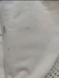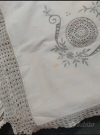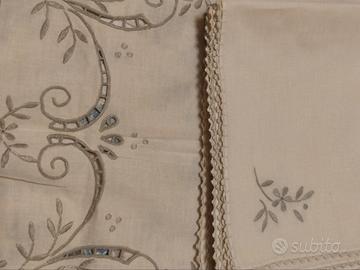 Stupenda tovaglia rettangolare da 12 ( non so se cotone o misto lino) con bellissimi ricami su intagli e lavorazione all' uncinetto, misura 1,70x2,40 completa di 12 tovaglioli che misurano 40x40 il tutto fatto a mano. Fa parte di un antico corredo, nuovissima,è ancora inamidata, ho evidenziato nelle ultime due foto dei puntini gialli sicuramente dovuti al tempo che andranno via al primo lavaggio.