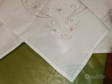 Tovaglia rettangolare interamente ricamata a mano, puro lino, con 12 tovaglioli. Misura 160x280 cm. Proveniente da un corredo. In perfette condizioni.