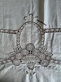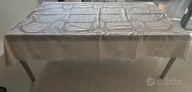 Vendo meravigliosa tovaglia in cotone ricamata a mano e rifinita a uncinetto con 11 tovaglioli. La tovaglia è ovale e misura 160 x 300 centimetri. I tovaglioli misurano 40x40 centimetri. Come nuovo mai usata ne’ lavata.