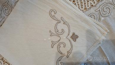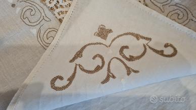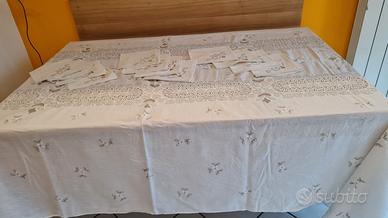 Tovaglia da 12 della metà del '900 di notevole pregio artigianale con inclusi i 12 tovaglioli. La lavorazione è mista e include inserti in pizzo Cantù (o pizzo a tombolo) e ricami a punto pieno e punto ombra.