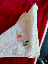 tovaglia interamente ricamata a man in misto lino,con bordo all' uncinetto,completa di 12 tovaglioli