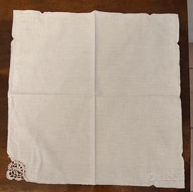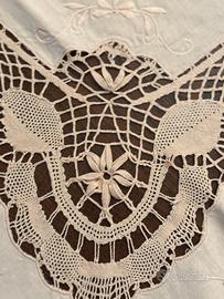 Vendo tovaglia in cotone con inserti e bordi di pizzo e ricami a mano