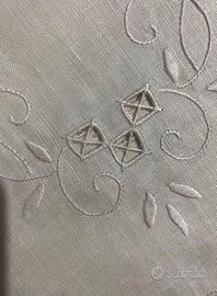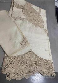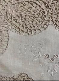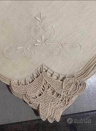 Tovaglia per 12 persone, in lino ricamata a mano pizzo di Cantù con tovaglioli coordinati
