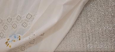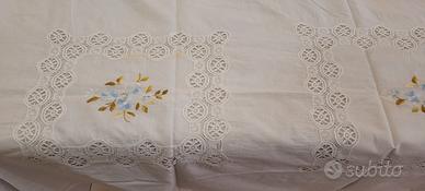 Tovaglia ricamata con lame' sotto da 12 posti con 12 tovaglioli e 11 tovagliolini da the'. Vendita a blocco no separatamente.
