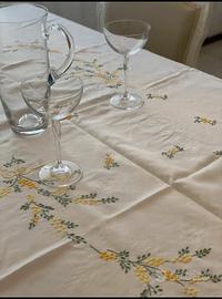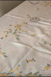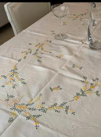 deliziosa tovaglia con dodici tovaglioli ricamata interamente a mano su lino con tralci di mimosa, un vero gioiellino.