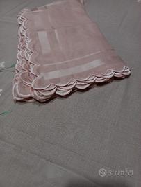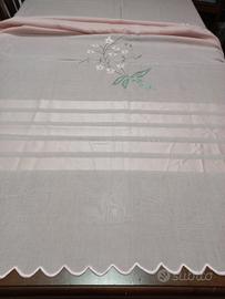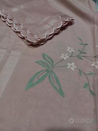 Tovaglia ricamata da tavola per 12, vintage anni '80, di colore rosa con ricami floreali colorati. Misura cm 270x174, con 11 tovaglioli cm 41x41.