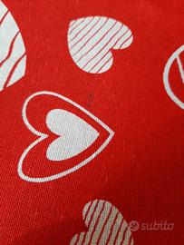 Tovaglia di San Valentino, per tavolo da 6/8 posti, caratterizzata da uno sfondo rosso con cuori bianchi.