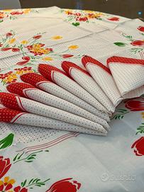 Tovaglia in cotone rotonda, fantasia tulipani, completa di 8 tovaglioli, nuova e mai usata, aperta solo per la foto
