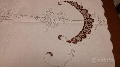 Tovaglia rotonda completa di otto tovaglioli, sono presenti intarsi e ricami, il colore è beige con dettagli dei ricami di colore grigio.
