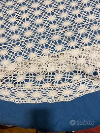 Bianchissima, senza macchie, appena lavata, lavorata all’uncinetto o al telaio. Verosimilmente in filato di cotone, e ‘ composta da 6 pezzi variamente sagomati, cuciti insieme e circondati da una bordura di disegno analogo . Fotografata su fondo blu, ma qualsiasi fondo in tinta unita si presta a valorizzarla. Integrs, senza strappi . Qualche piccolo segno di usura qua e la’ , appena percettibile solo con attento esame.