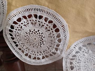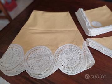 Tovaglia rotonda diametro cm 172 in cotone e pizzo, completa di 8 tovaglioli piccoli, 8 grandi e di una tovaglietta.