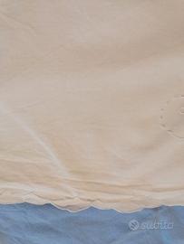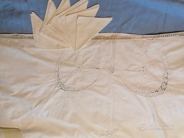 Diametro cm. 152, con applicazioni s uncinetto e ricamo a intaglio. Ha il bordo smerlato e 6 tovaglioli con un piccolo ricamo