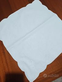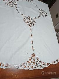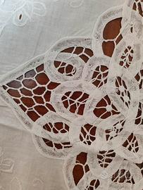 Bellissima TOVAGLIA ROTONDA con ricami e applicazioni in pizzo, con 8 tovaglioli, diametro cm. 160, rinfrescata per rimuovere le macchioline da cassetto, ora è perfetta