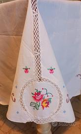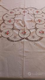 tovaglia tonda in puro cotone ricamata con inserti ad uncinetto. bianca mai usata soggetto rose, diametro 165 cm