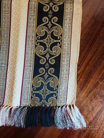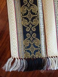Elegante tovaglia damascata originale siriana, mai utilizzata, con colori oro chiaro su bande nere, munita di frange sui due lati corti.