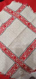tovaglia tappeto tavola per 8 posti in canapa e lino fondo color beige con ricami rossi e neri a punto giglio rifinita con frange spettinate e corredata di 8 tovaglioli uguali