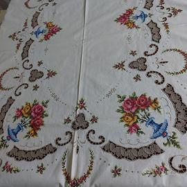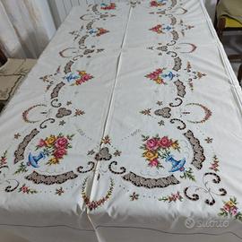 Vendo elegante tovaglia floreale vintage rettangolare, degli anni '60, impreziosita da ricami interamente realizzati a mano con punto croce ed inserti all'uncinetto.