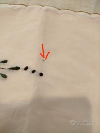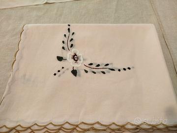 Tovaglia vintage corredo , ricamata a mano, nuova senza cartellino ,mai utilizzata . Corredata di 6 Tovaglioli grandi 40x40 cm. , e altri più piccoli da utilizzare , eventualmente come sottobicchiere, 18x18cm. misure tovaglia 260x170 cm c.a Colore rosa chiaro, colori ricamo bianco verde marrone. Piccola macchia evidenziata in foto.Disponibile per consegna di persona.