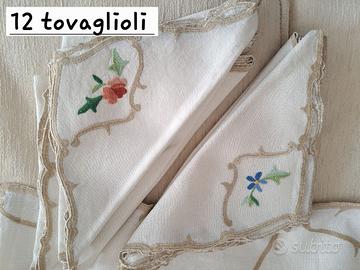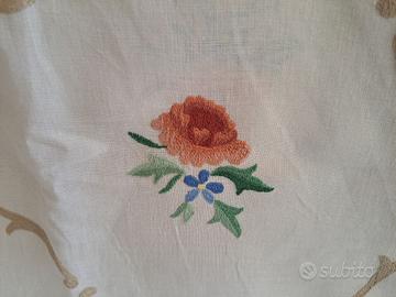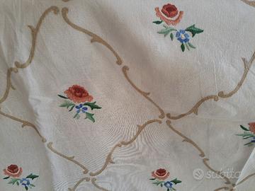 bellissima tovaglia vintage di lino bianca con ricami di fiori colorati e molti ricami beige lungh 2,90 x 1,60 e 12 tovaglioli ,in perfetto stato