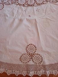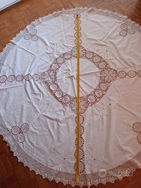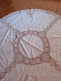 Bellissima tovaglia tonda vintage tutta ricamata a mano e con inserti e bordo eseguiti all'uncinetto. diametro cm. 180 Ca. ottime condizioni