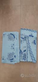 Tovaglia vintage ovale nuova in cotone completa di 12 tovaglioli. Colore azzurro con disegni in blu e grigio. Lunghezza massima tovaglia cm 238, larghezza massima 175. Misura tovaglioli: cm 43 x 43 circa.