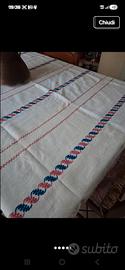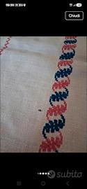 tovaglia vintage portoghese ricamata a mano con decori paralleli rossi e blu in lino rustico grossolano artigianale.