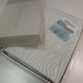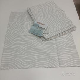 In puro cotone con 12 tovaglioli marca VALLESUSA. La tovaglia presenta delle scoloriture da esposizione (come evidenziato in foto).