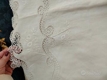 tovagliato antico in puro Lino di alta qualità per 12 con 12 tovaglioli bianco interamente ricamato a mano e lavorato a chiacchierino. Pezzo raro