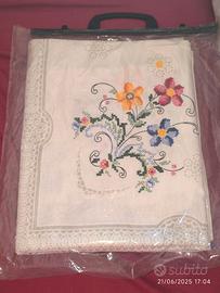 Il bianco candido del fondo mette in risalto l’armonioso decoro floreale, eseguito con tecnica mista: ricamo a punto croce e applicazioni in pizzo traforato tono su tono. Il ricamo, posizionato con cura negli angoli e lungo i bordi principali, raffigura eleganti ramificazioni vegetali. I grandi fiori, definiti con petali arrotondati, sono resi con una tavolozza vivace: spiccano sfumature di giallo zafferano, rosa salmone intenso e blu pervinca, alternate a toni più delicati di lilla e verde oliva. Ogni petalo è composto da piccole crocette regolari, ed è studiato per conferire profondità cromatica grazie all’uso di filati di diverso spessore, creando punti luce naturali.