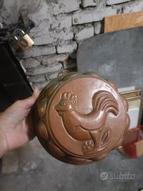 regalo 4 tovaglie in PVC anni 80 una forma per budini in rame, con disegno di un gallo un cestino in legno e ferro per la frutta