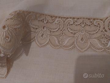 2 splendide tovaglie in puro lino colore ecrù, una rettangolare 12 posti dimensioni lunghezza cm 280 larghezza 175 con grande ricamo centrale, l'altra rotonda diametro circa 1.95 cm con ricamo intorno, complete di 20 tovaglioli, 20 tovagliolini dessert, 12 sottobicchieri 2 tovagliette rettangolari e una ovale - dal baule della nonna