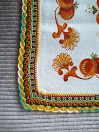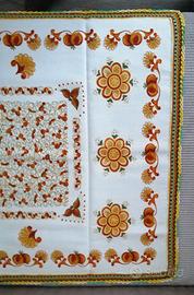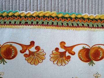 Tovaglietta in puro cotone spina pesce, con stampa artigianale romagnola a motivo "fiori e melograno" . Nuova, mai usata, marchio "Casabiancheria" (ma non etichetta). Rifinita a mano con bordo all'uncinetto in cotone multicolor che richiama le tinte della stampa, aggiunto dopo l'acquisto. Misure: cm. 85x63. Spedizione Poste Italiane.
