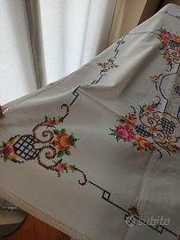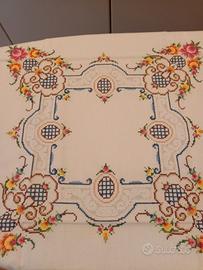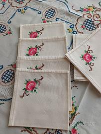 Tovaglietta da the quadrata, ricamata a punto croce e punto sfilato, completa di 6 tovaglioli.