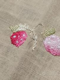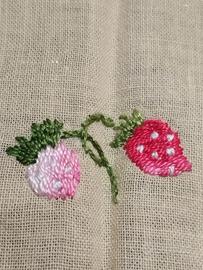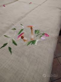 Tovaglietta giallo chiaro tessuto fine con ricami funghi e fragoline misura cm 80 x 83 completa di 6 tovaglioli ottimo stato