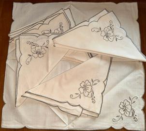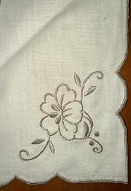 Tovaglioli in puro lino, color Ecrú con bordo smerlato tortora. Finemente ricamati a mano con delicati motivi floreali. Il bordo elegantemente rifinito valorizza il design classico, ideali per qualsiasi occasione.
