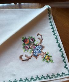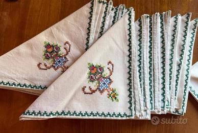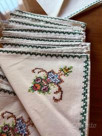 Aggiungi un tocco di raffinatezza alle tue cene con questi splendidi tovaglioli in tessuto bianco, decorati con dettagliati ricami a punto croce.