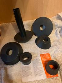 Composto da 6 elementi ad anello - tra i quali il tubo interno in alluminio- componibili a piacimento per cambiare forma al vaso e utilizzarlo come un gioco.