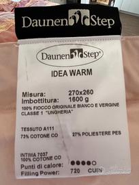 DAUNENSTEP Idea Warm - Trapunta in piuma con fantasia floreale particolarmente pregiata, interno col.rosa 270x260 cm, 1600 g 100%fiocco originale bianco e vergine. Punti di calore: ●●●●○ tessuto 73%CO 27%PL PES. Filling power 720. Con angoli arrotondati. Usata pochissimo.