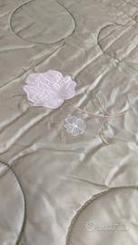 Trapunta per letto matrimoniale in raso di colore verde con applicate decorazioni beige e riccio laterale.
