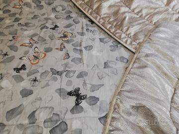Calda trapunta matrimoniale invernale double face Gian Marco Venturi. Stile moderno. Angoli arrotondati. Un lato luminoso color argento/bronzo, altro lato grigio con petali e farfalle. Misure 270x250 centimetri, peso 3,6kg.