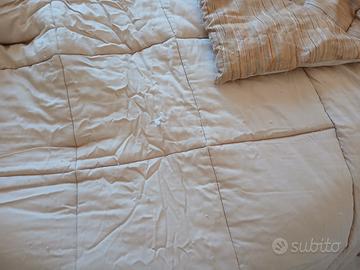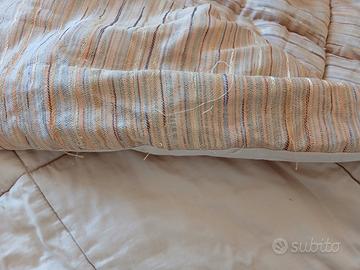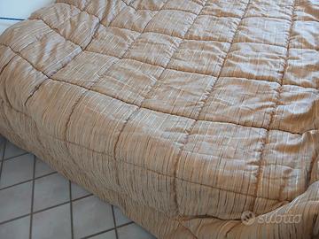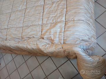 Splendido trapuntone per letto matrimoniale, ideale per la stagione invernale grazie alla sua generosa imbottitura. Il design è caratterizzato da una raffinata trama a righe orizzontali multicolore sulle tonalità dell'oro, bronzo, panna e grigio antracite, con finitura leggermente lucida che dona luminosità alla stanza. Caratteristiche Principali: Stile: Classico / Elegante. Lavorazione: Tessuto operato con trama a rilievo e trapuntatura a quadri per mantenere l'imbottitura uniforme. Colori: Palette calda ed elegante (Oro, Champagne, Bronzo). Versatilità: Il lato inferiore è in tinta unita beige/panna per una maggiore morbidezza a contatto con il corpo. Dettagli: Bordi rifiniti con cura. Stato dell'oggetto: Il tessuto esterno è in buone condizioni generali e i colori sono vividi. Nota per trasparenza: Sono presenti alcuni piccoli fili tirati sulla superficie e tracce di pilling (pallini di imbottitura/tessuto) sul lato interno, come mostrato nelle foto di dettaglio. Nulla che ne pregiudichi l'utilizzo, ma corretto da segnalare.