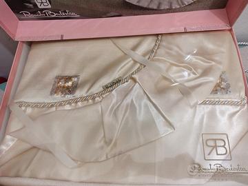 Il colore è un panna/avorio con dettagli ricamati e inserti luminosi. È rifinita con balza elegante sul bordo e lncude cuscino coordinato con logo RB (come in foto)