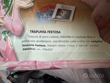 Vendo bellissima trapunta singola originale Caleffi Disney Princess, modello Festosa, colore rosa. Caratteristiche: * misura singola 170x265 cm * marca Caleffi * fantasia Principesse Disney * tessuto in puro cotone * imbottitura in fibra di poliestere anallergica * ideale per cameretta bimba * articolo in confezione La trapunta è molto bella, con stampa delle principesse Disney e tonalità rosa delicate, perfetta per arredare la cameretta. se non è mai stata usata: nuova / mai usata