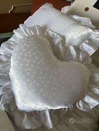 Bellissima trapunta vesti letto completo di 2 cuscini, uno a cuore e l’altro quadrato, in raso setificato, ideale per il giorno piu bello, il matrimonio. Mai usato, solo esposto 1 volta per book fotografico.